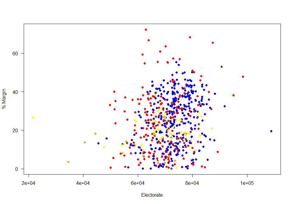 I have decided to put the mapping data to one side at the moment – lots of maps (of both winners and runners-up) abound at the moment, and detailed spatial analysis will wait until I confirm the data about electorate sizes.