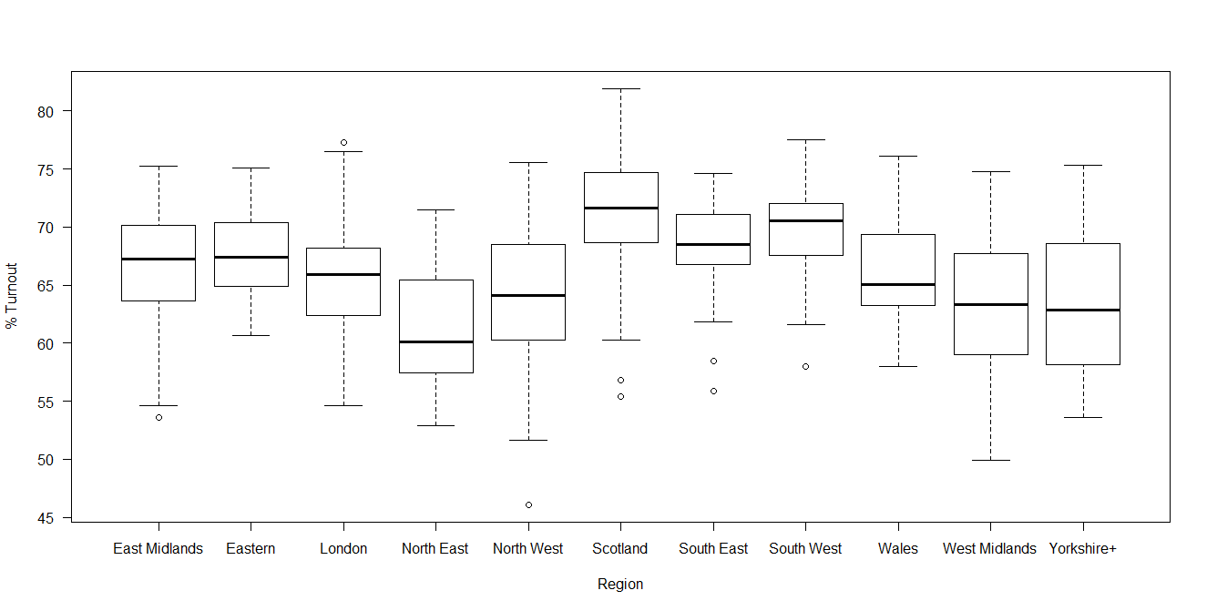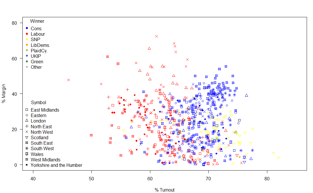 So, what is striking about this image? Some Labour MPs had a huge margin of victory. Really a margin of victory of greater than 20% of voters is inefficient distribution of votes. Otherwise, the main talking points are the high turnout in many Scottish constituencies and the fact that the SNPs didn’t have the complete landslide of votes that their return of seats (almost 95% of Scottish seats) suggested and also that there was a much higher turnout in Conservative seats than in Labour seats.